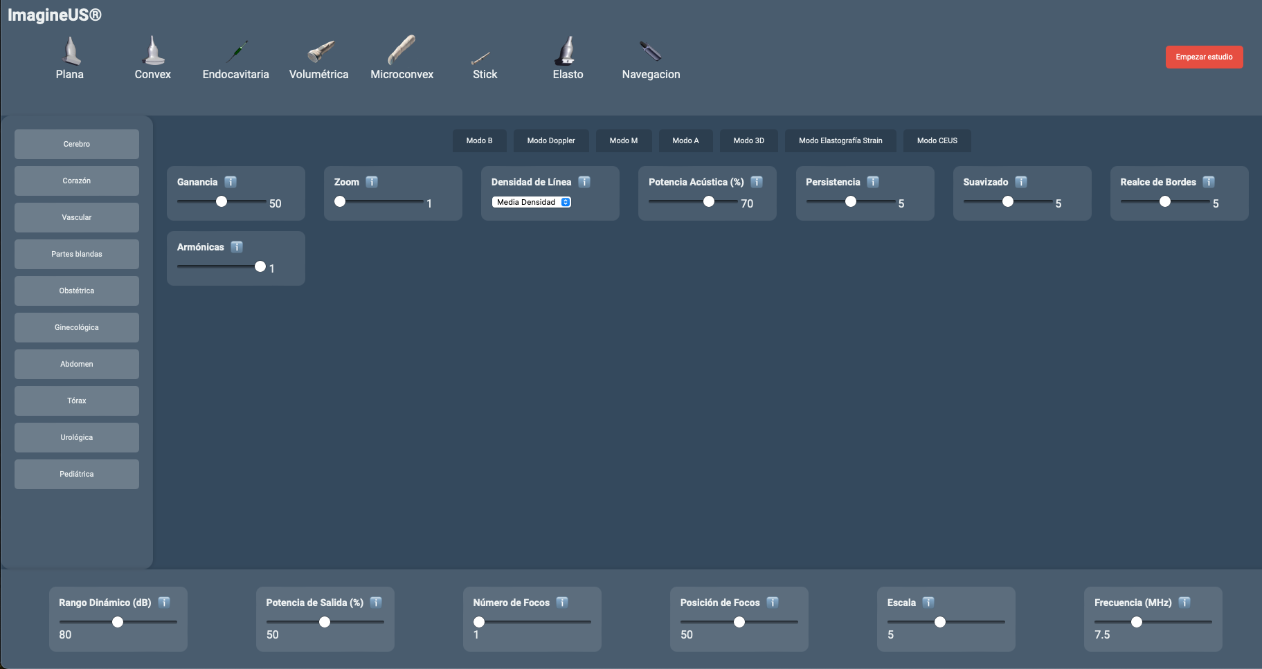 Determine si la exploración está dirigida a tejidos superficiales, estructuras profundas, cavidades, o si se requiere para procedimientos invasivos o intervencionistas. -